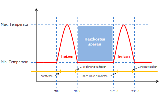 Sie können die Heizzeiten und die gewünschten Temperaturen programmieren. Sollten Sie zum Beispiel jeden Morgen um 07:30 Uhr aufstehen, können Sie den Heizkörperregler so programmieren, dass eine halbe oder eine viertel Stunde vorher, dass Badezimmer auf die gewünschte Temperatur vorgeheizt wird. Sollten Sie sich nicht mehr in der Wohnung befinden, können Sie den Heizkörperregler so programmieren, dass eine niedrigere Temperatur gehalten wird. Dies spart wertvolle Energie und gleichzeitig sinken Ihre Heizkosten um bis zu 30%. Zur Veranschaulichung eines möglichen Heizintervals, schauen Sie sich die folgende Infografik an:
